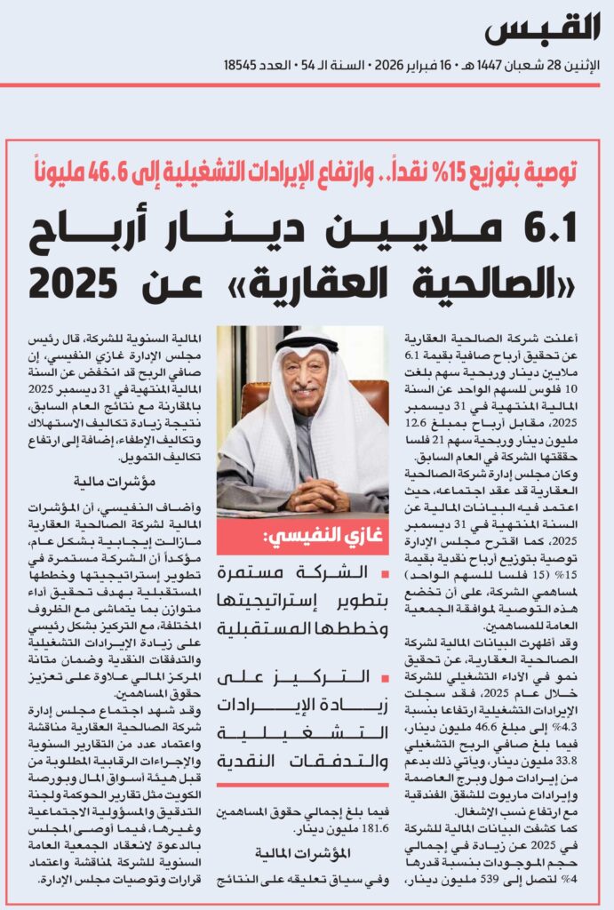 الصالحية تحقق 6.1 مليون دينار أرباحا عن 2025